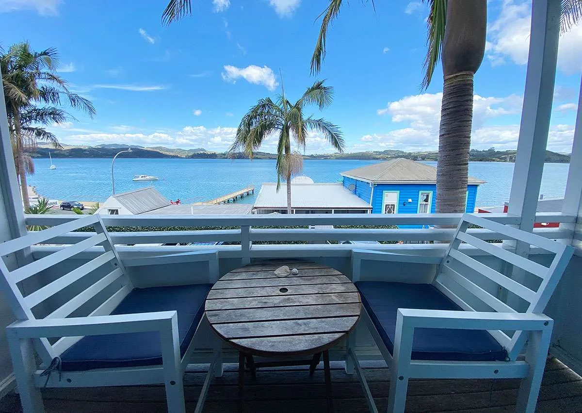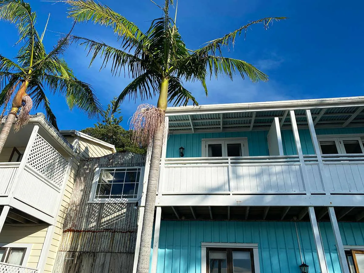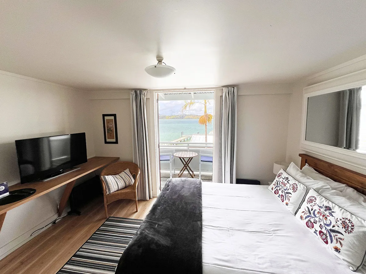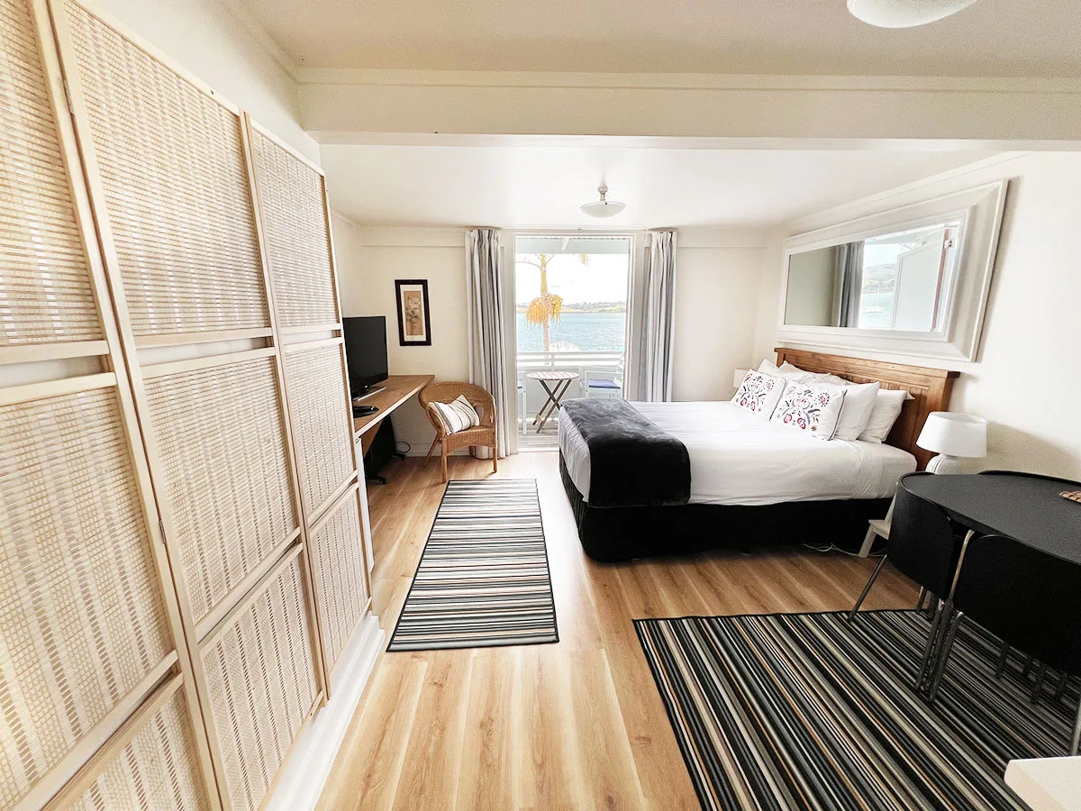 Enjoy loft living in this cosy upstairs open plan studio with a well-equipped kitchenette, Double bed, dining suite, bathroom and private balcony with spectacular harbour views surrounded by palm trees.