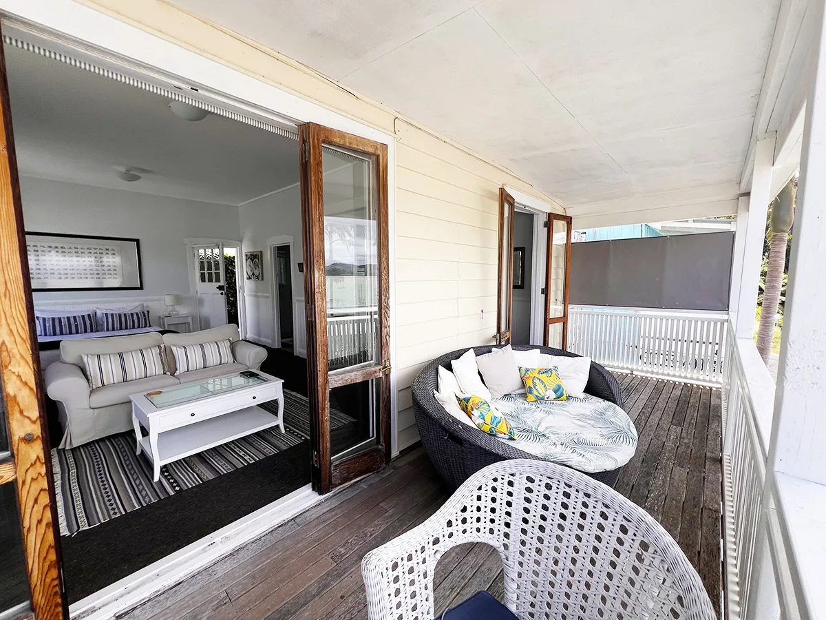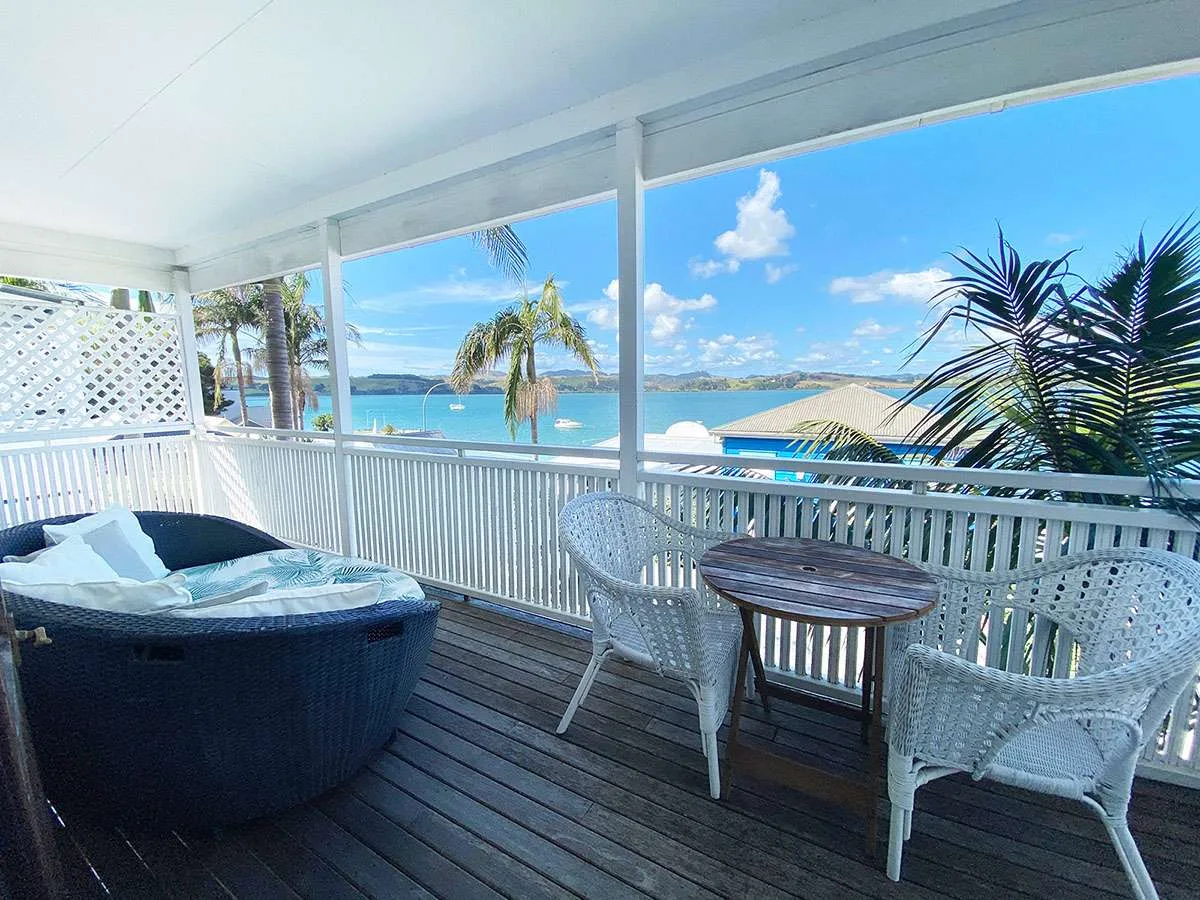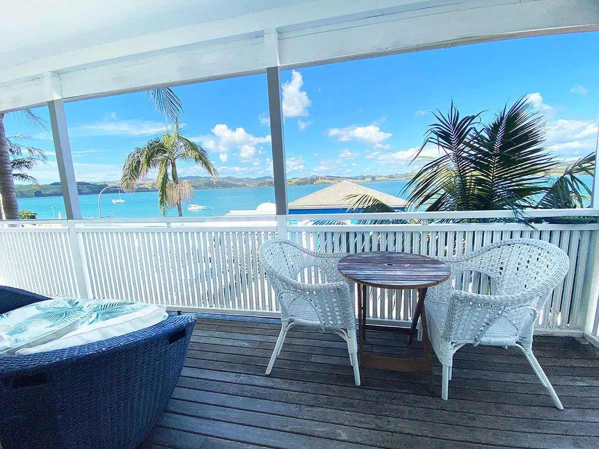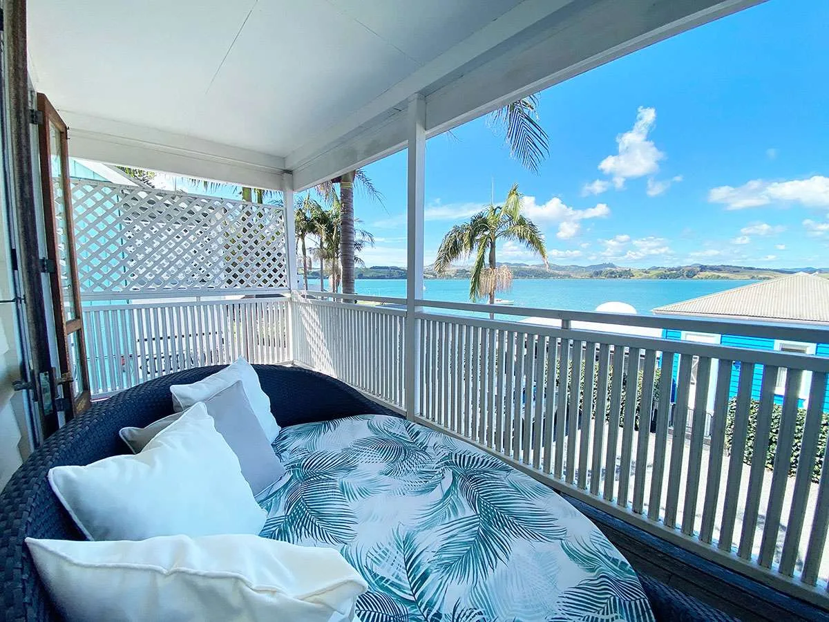 Soak in the vista of Mangonui Harbour in privacy and comfort from your expansive elevated balcony with cafe table setting and a cosy day bed big enough for two.